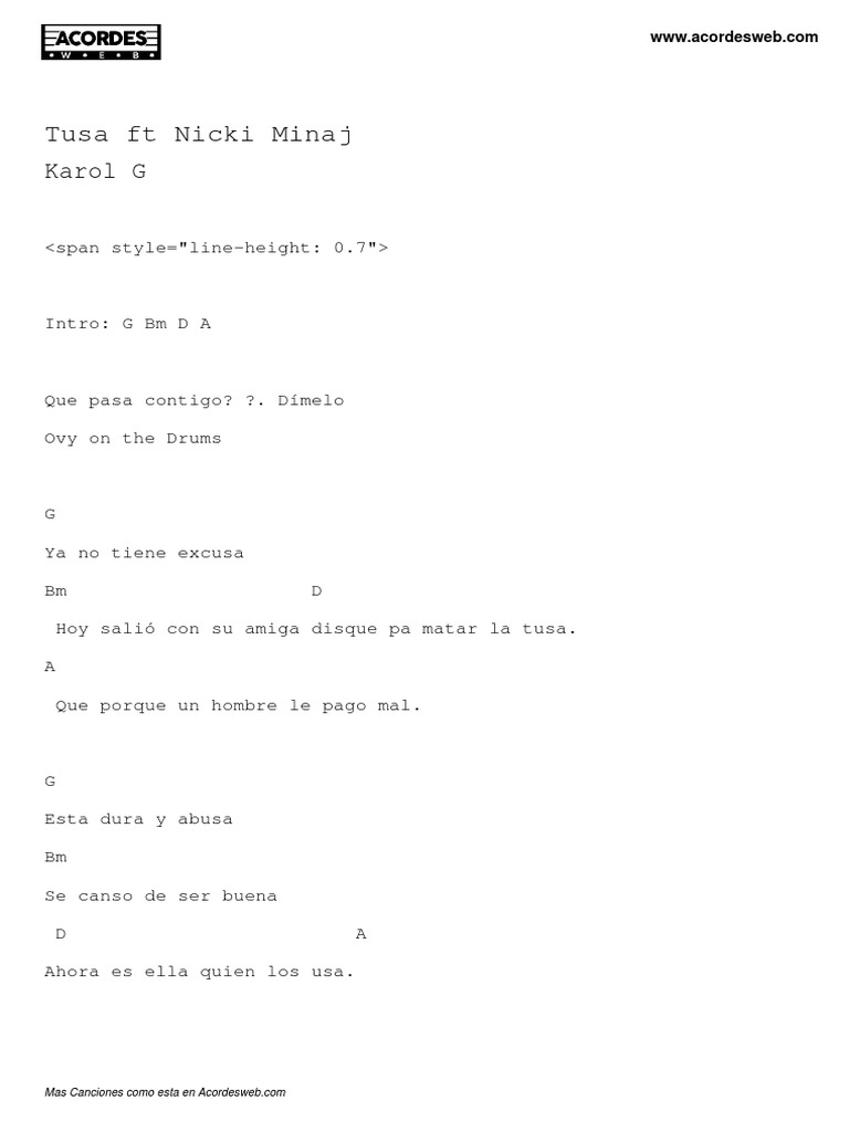 Bm le da una depresion tonta d a llorando lo comienza a llamar g pero el la dejo en buzon bm sera porque con otra esta. Acordes letra y tablatura de la cancion tusa ft nicki minaj de karol g. Acordes letra y tablatura de la cancion tusa feat.